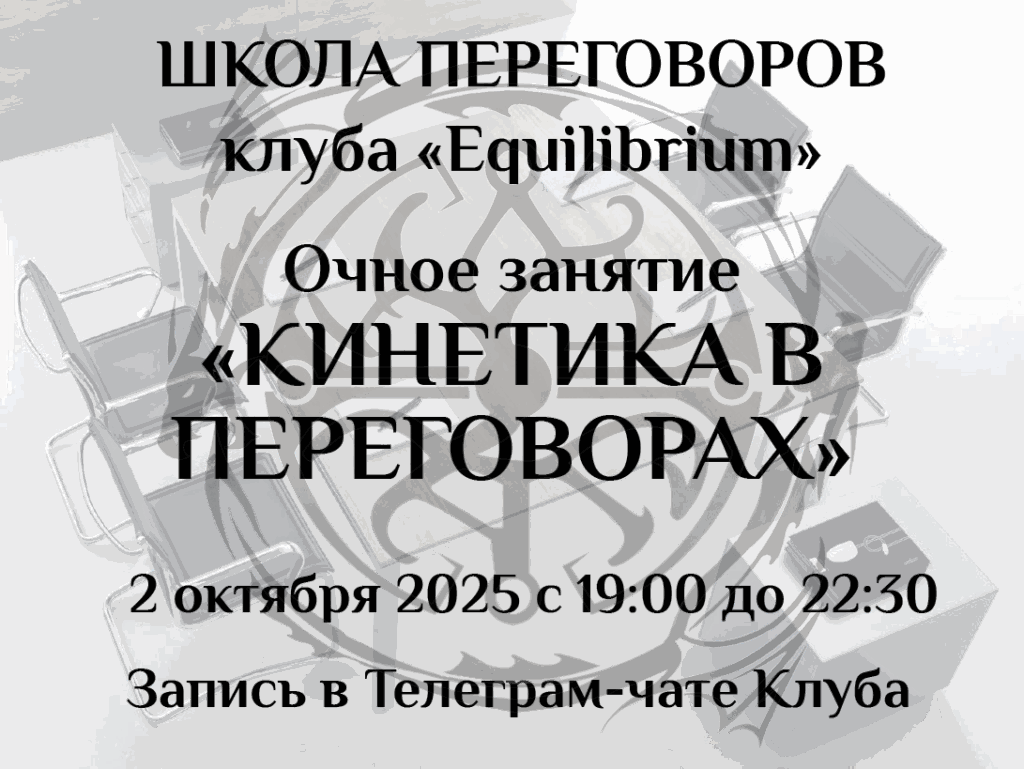 Кинетика — это про то, как ведёт себя наше тело. И насколько поведение тела соответствует нашим словам (конгруэнтно). Как правильно выстраивать свой кинетический имидж в переговорах будем говорить на ближайшем занятии.Поскольку со стороны мы себя на видим, то будем записывать на камеру происходящее и потом анализировать. Ситуации будут даны заранее, чтобы не тратить время на подготовку.